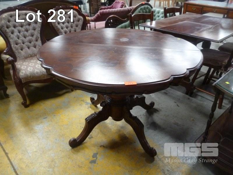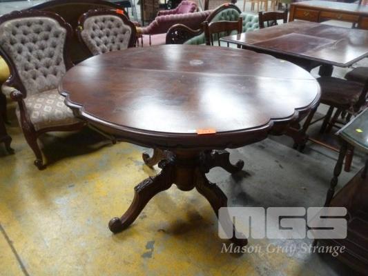 MAHOGANY ROUND CLOVER TOP, EXTENSION DINING TABLE, MARQUETRY INLAY, SINGLE PEDESTAL