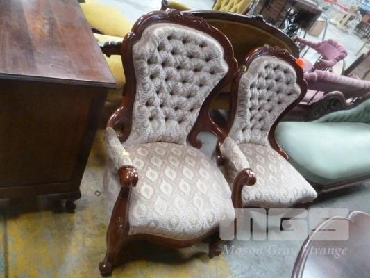 ORNATE CARVED GRANDMOTHER & GRANDFATHER CHAIRS, PINK FABRIC