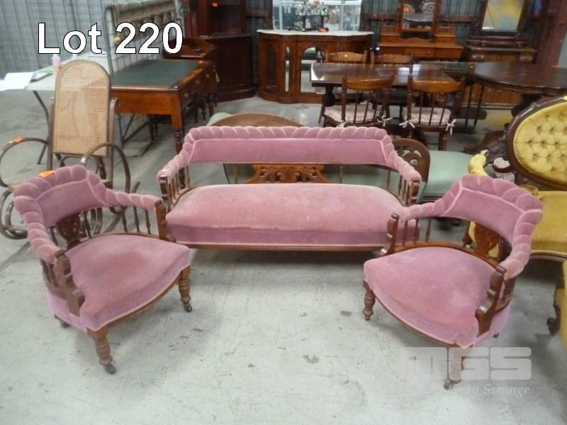 VINTAGE ORNATE, 3 PIECE LOUNGE SUITE, PINK FABRIC, TIMBER FRAME, CERAMIC CASTORS, INC; 2 SEATER & 2 X SINGLES