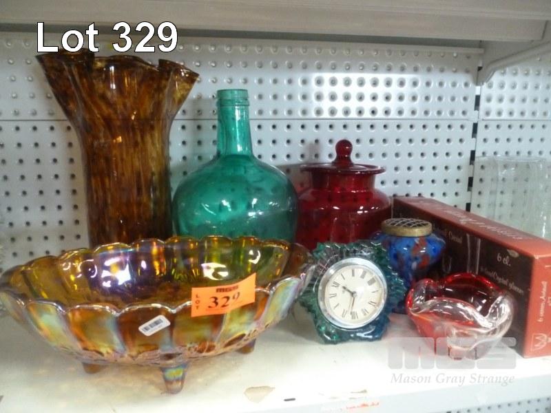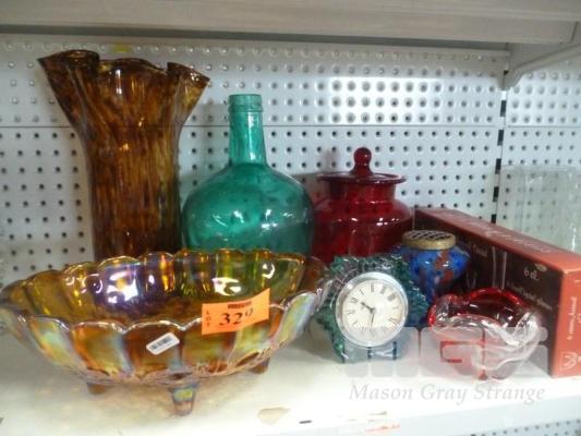ASSORTED ART GLASS INCLUDING MARIGOLD CARNIVAL GLASS FRUIT BOWL, VASES, JARS, ETC