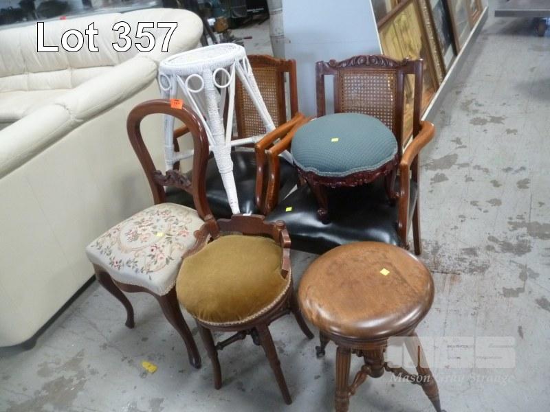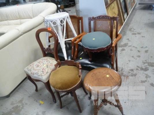 PAIR ARM CHAIRS, BALLOON BACK, TAPESTRY UPHOLSTERED, WHITE CANE STOOL, GOLD VELVET STOOL, ADJUSTABLE STOOL, BALL CLAW FEET & FOOT STOOL