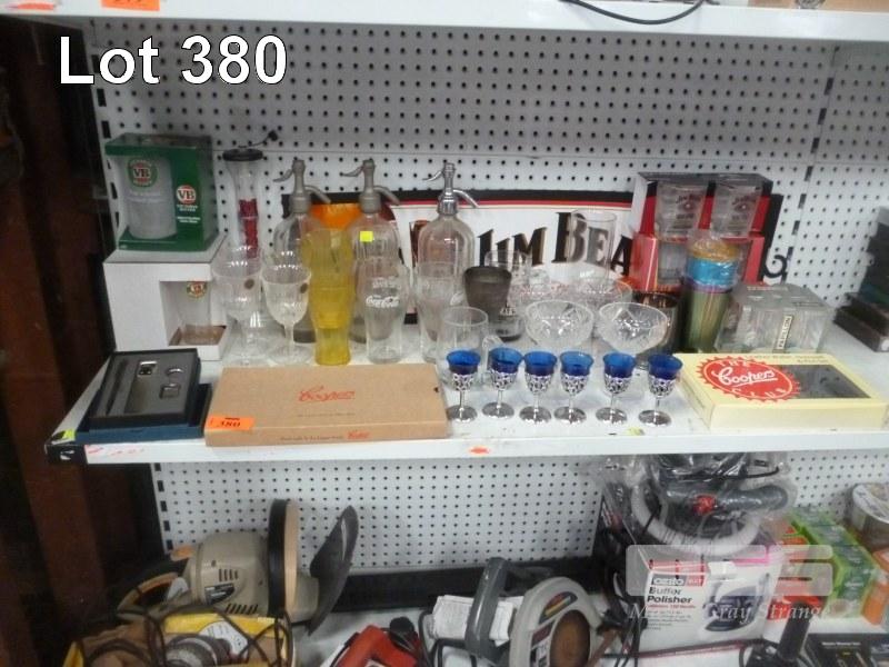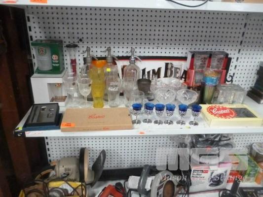 ASSORTED BARWARE, WOODROOFE SODA BOTTLES, GLASSWARE, ETC