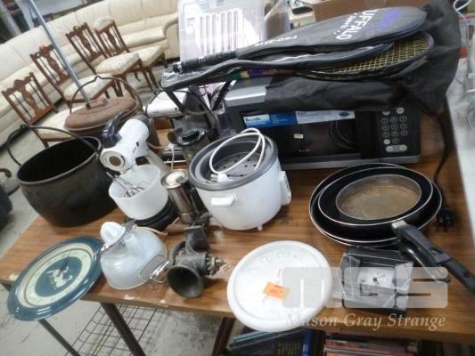 BREVILLE MICROWAVE, SUNBEAM MIX MASTER, ETC WITH 2 x CAMP OVENS & TENNIS RACKETS, 1 x TABLE