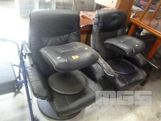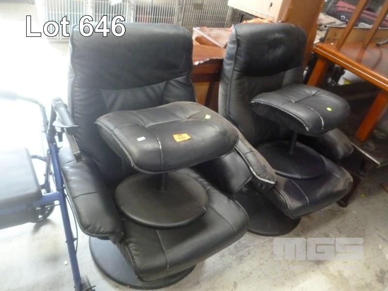 2 x BLACK VINYL UPHOLSTERED ARM CHAIRS WITH FOOT STOOLS