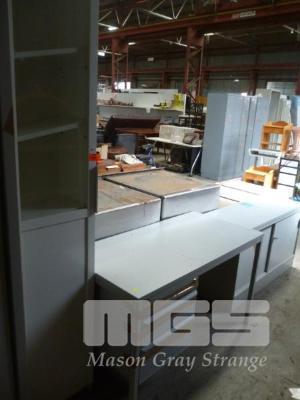3 x PIECES GREY MELAMINE OFFICE FURNITURE, DESK, LOWLINE CABINET, WITH KEY & NARROW SHELF UNIT, SINGLE DOOR