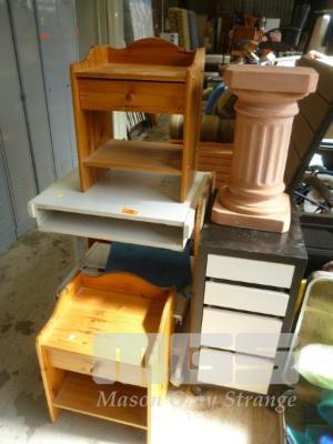 GREY MELAMINE MOBILE WORK STATION, TIMBER LAMINATE MOBILE DRAWER UNIT, PAIR TIMBER SIDE CABINETS & PLASTER PEDESTAL