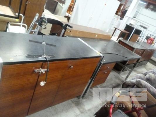 RETRO 5 PIECE OFFICE SUITE, CHROME FRAME, BLACK VINYL, TIMBER VENEER, INCLUDING DESK, EXECUTIVE CHAIR, 3 DOOR CABINET WITH INBUILT UNDERBAR FRIDGE & 2 x 3 DOOR/DRAWER CABINETS