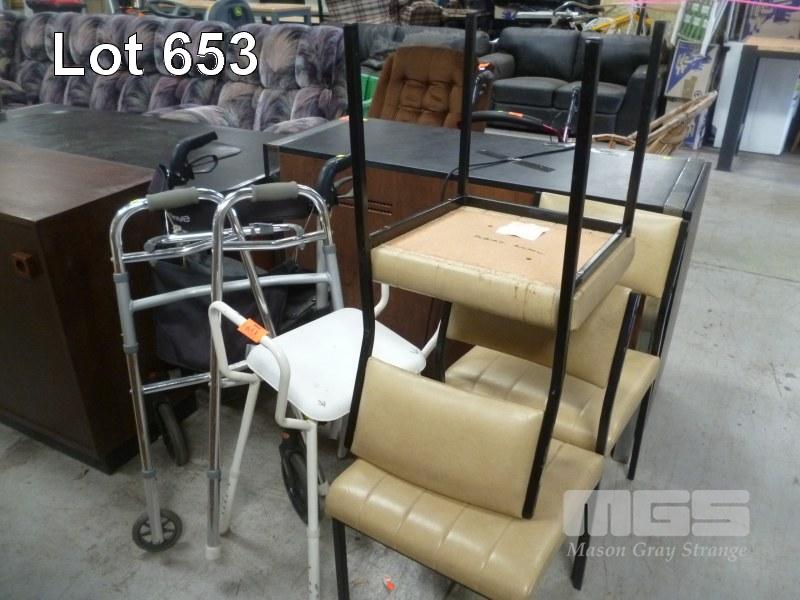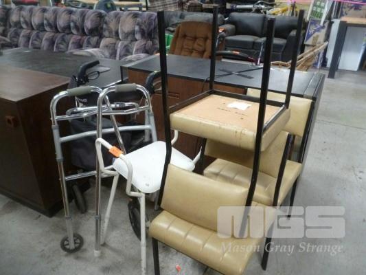3 x MOBILITY WALKERS, ASSIST CHAIR & 3 x DINING CHAIRS, METAL FRAME, BEIGE VINYL