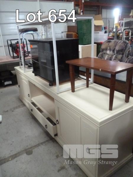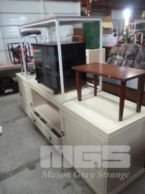 BEIGE PAINTED TIMBER LOWLINE ENTERTAINMENT UNIT, 2.3m (L), STEREO CABINET, FOOT STOOL, TABLE & SIDE TABLE