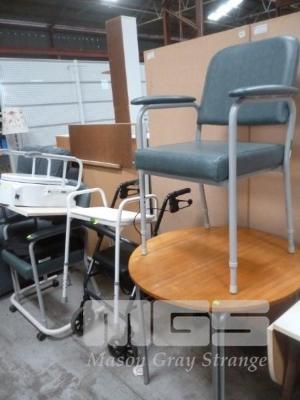 ASSORTED ASSIST CHAIRS, MOBILITY WALKER, MOBILE TABLE & ROUND DINING TABLE