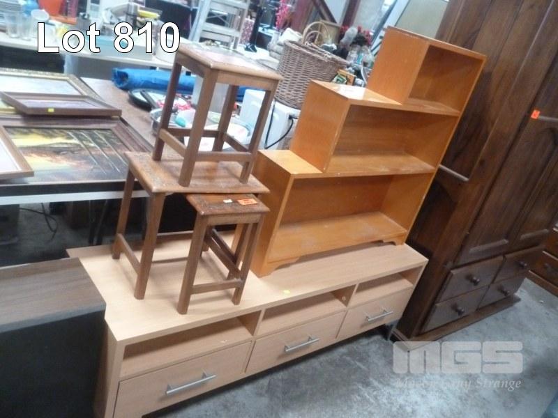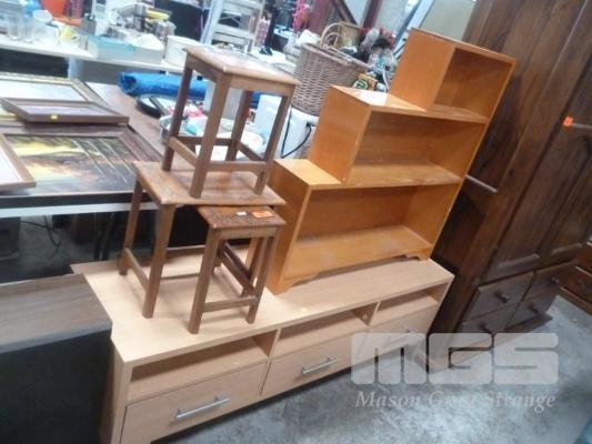 TIMBER VENEER LOWLINE ENTERTAINMENT UNIT, TIMBER BOOKCASE & NEST OF 3 TABLES