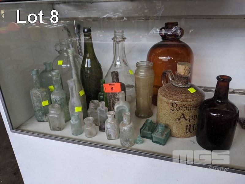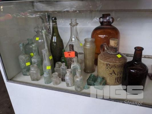 COLLECTION VINTAGE BOTTLES, AMBER GLASS DEMIJOHNS, GREEN PICKAXE & STONEWARE BOTTLE, ETC