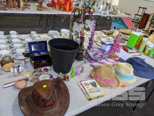 ASSORTED COSTUME JEWELLERY, PAIR LAMPS, LEATHER HAT, HOMEWARES, ETC, 1 x TABLE