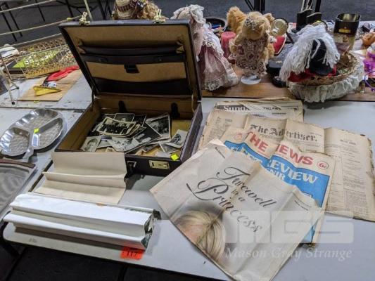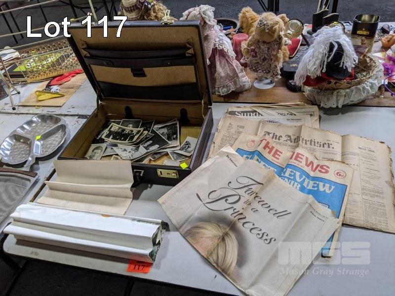 ASSORTED VINTAGE NEWSPAPERS, BRIEFCASE, OLD PHOTOS, ETC