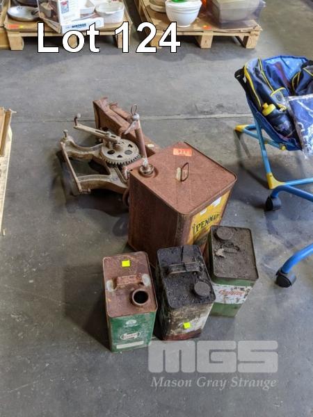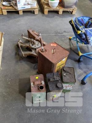 HI LIFT HEAVY DUTY JACK, WALL MOUNT HAND DRILL, 2 x CASTROL IMPERIAL GALLON OIL CANS, 1 x MOBILUBE IMPERIAL GALLON OIL CAN & PENNANT KEROSINE CAN.