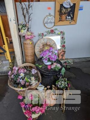 ASSORTED ARTIFICIAL FLOWERS, WALL SHELF, CANE WARE, ETC
