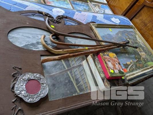 FRAMED PRINT,VINTAGE TINS, WALKING STICKS, ETC