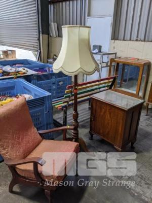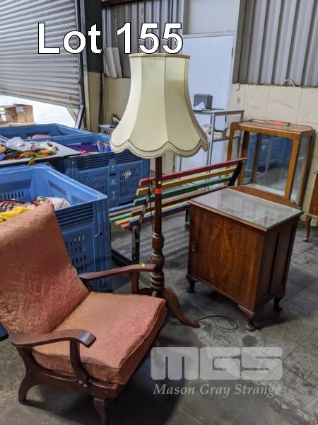 OAK CABINET, CARVED TIMBER STANDARD LAMP, STOOL & ARM CHAIR