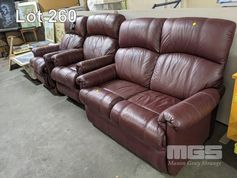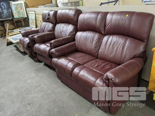 BURGUNDY LEATHER UPHOLSTERED 3 PIECE LOUNGE SUITE, 2 SEATER & 2 x RECLINER ARM CHAIRS INCLUDING 1 x ELECTRIC RECLINER