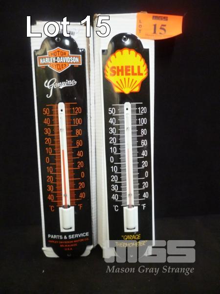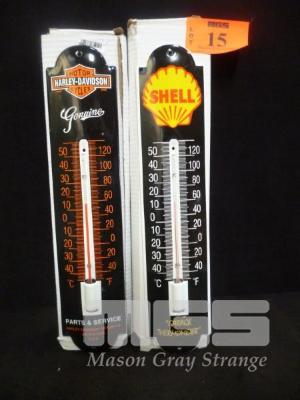 REPRODUCTION ENAMEL THERMOMETERS, SHELL & HARLEY DAVIDSON