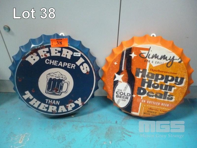 2 x REPO SCREEN PRINT TIN BOTTLE CAP SIGNS, JIMMYS BAR GRILL & BEER IS CHEAPER THAN THERAPY