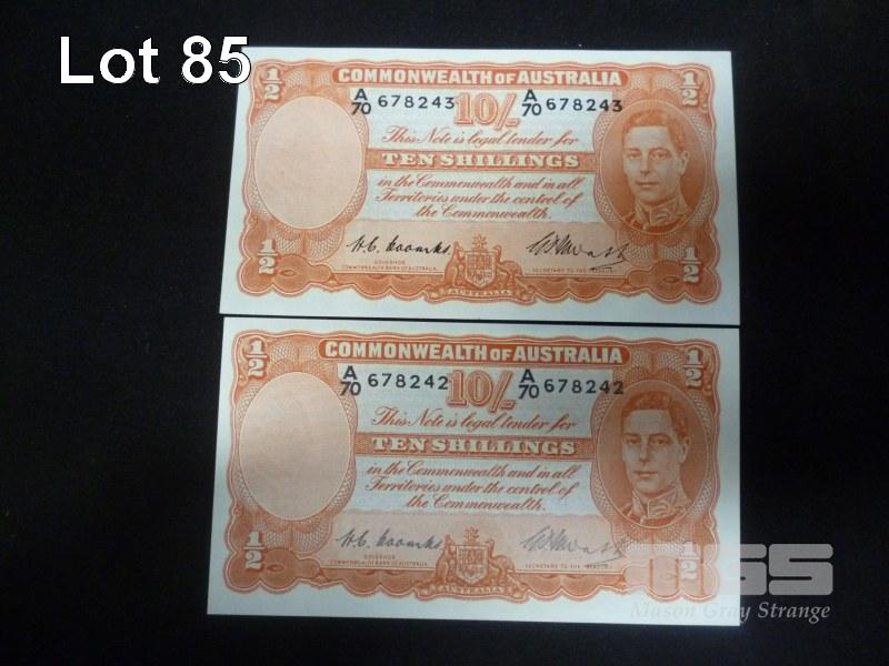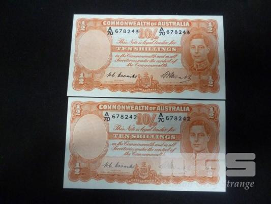 1949 2 x 10 SHILLING NOTE COOMBS WATT CONSECUTIVE APPEARS UNC