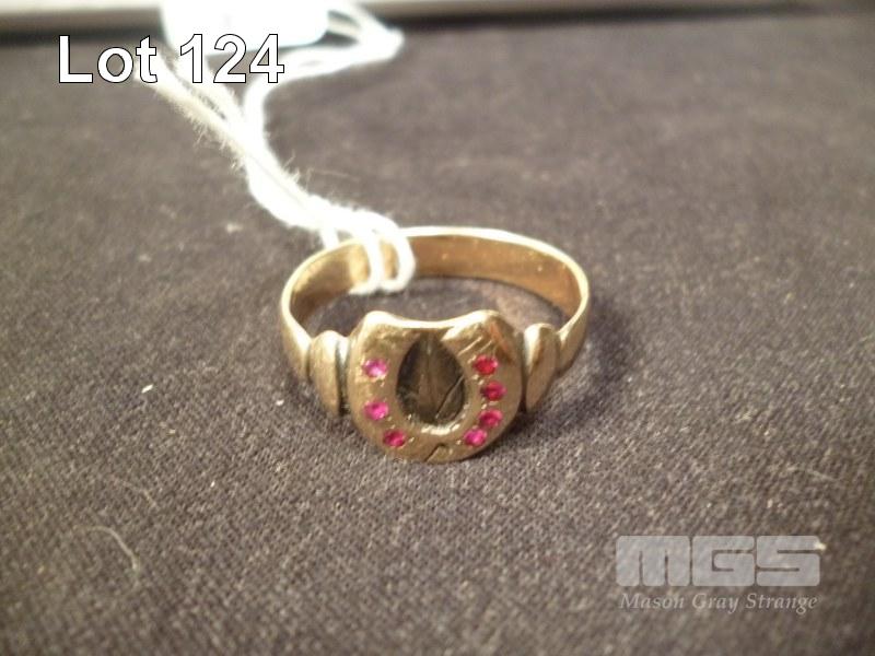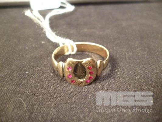 GOLD RING, HORSE SHOE DESIGN, SET WITH 6 X RED STONES, NO HALLMARKS, TESTED 9k, 4.65grams
