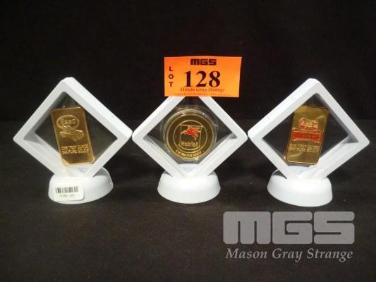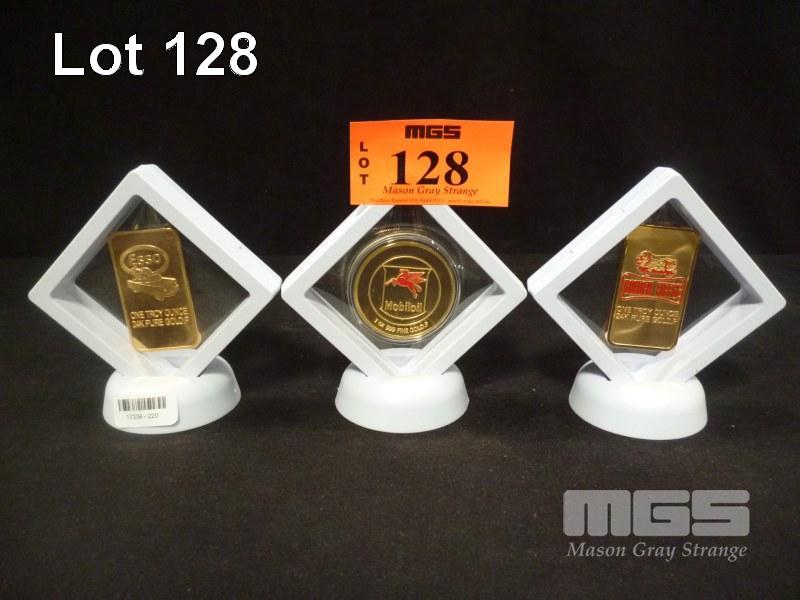 3 x GOLD PLATED INGOTS, ESSO, MOBILOIL & GOLDEN FLEECE
