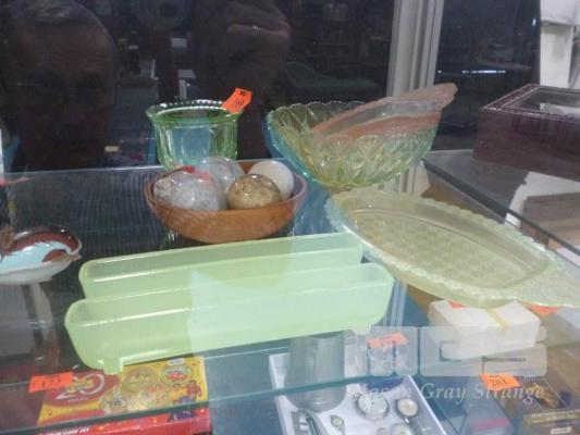 2 X URANIUM GLASS FLOWER FROGS, DEPRESSION GLASS & ASSORTED EGGS