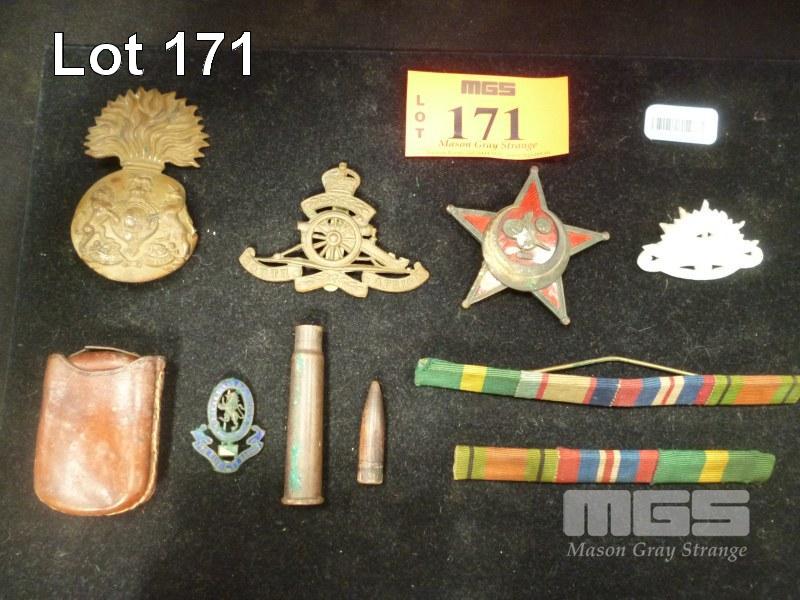 EARLY MILITARY HAT BADGES, RIBBON BARS & SHELL CASING