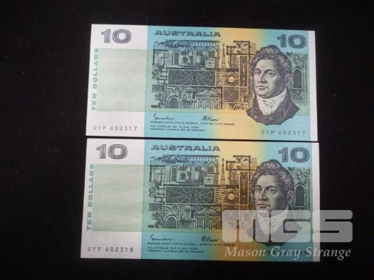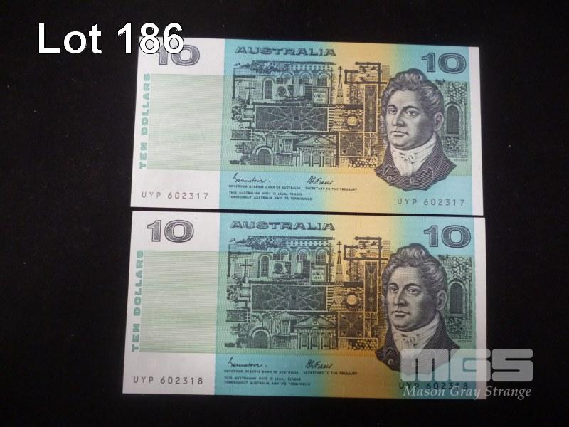 1985 2 x $10.00 CONSECUTIVE NOTES JOHNSTON FRAZER UNC