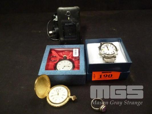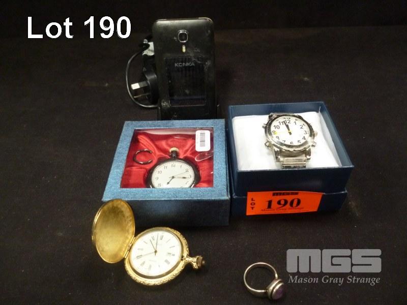 TAB TIMER TALKING WRIST WATCH, 2 X CLASSIC POCKET WATCHES (ALL FAULTS), SILVER COLOURED RING, SET WITH PURPLE STONE & KONKA MOBILE PHONE (ALL FAULTS)