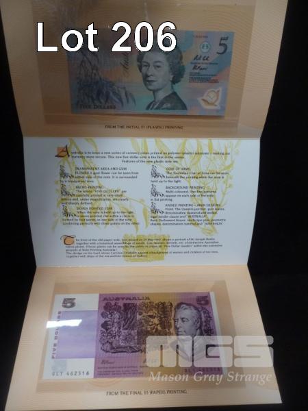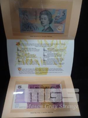 NOTE PRINTING AUSTRALIA $5 BANKNOTE SET, INITIAL 5$ PLASTIC PRINTING & FINAL $5 PAPER PRINTING