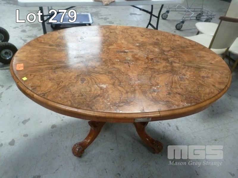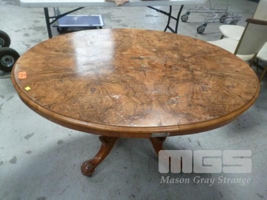 BURL WALNUT VENNERED OVAL DINING TABLE ON SINGLE PEDESTAL BASE, VENEER BUBBLED AND PEELING IN PLACES