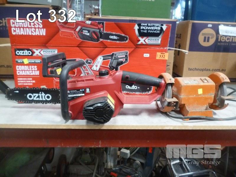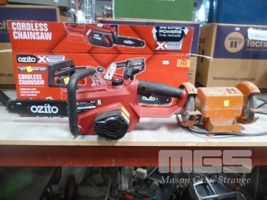 OZITO 10" CORDLESS CHAINSAW, AXCCSS-018, NO BATTERY OR CHARGER, WITH GMF 125mm BENCH GRINDER
