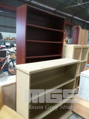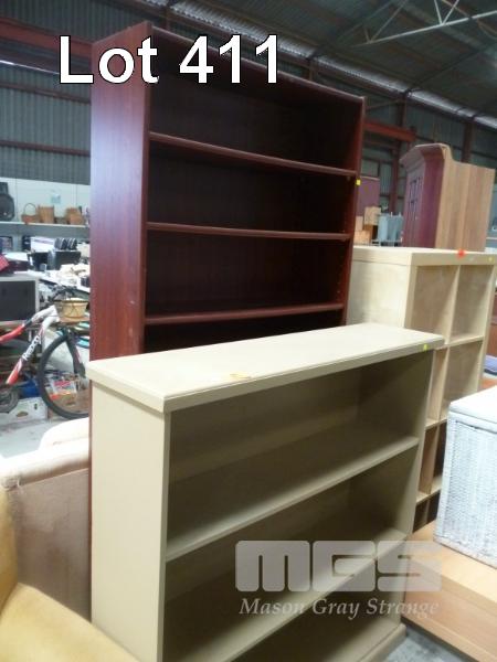 2 x BOOKCASES, 1 x MAHOGANY STAINED FULL HEIGHT, 1 x BEIGE PAINTED HALF HEIGHT