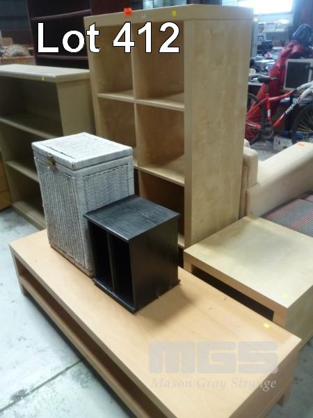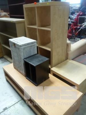 BLONDEWOOD LAMINATE PIGEON HOLE UNIT, CANE BASKET, COFFEE TABLE & REVOLVING CD RACK