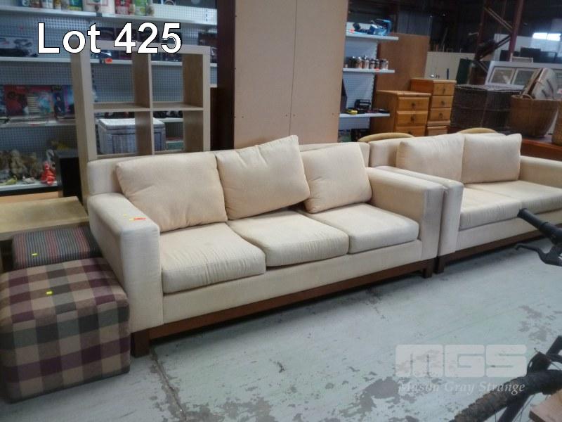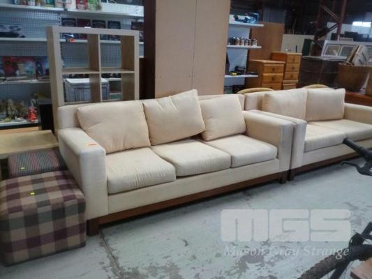 2 x BEIGE FABRIC UPHOLSTERED SOFAS, 1 x 3 SEATER, 1 x 2.5 SEATER (SOME SCRATCH WEAR TO ARMS) & 2 x FABRIC OTTOMANS