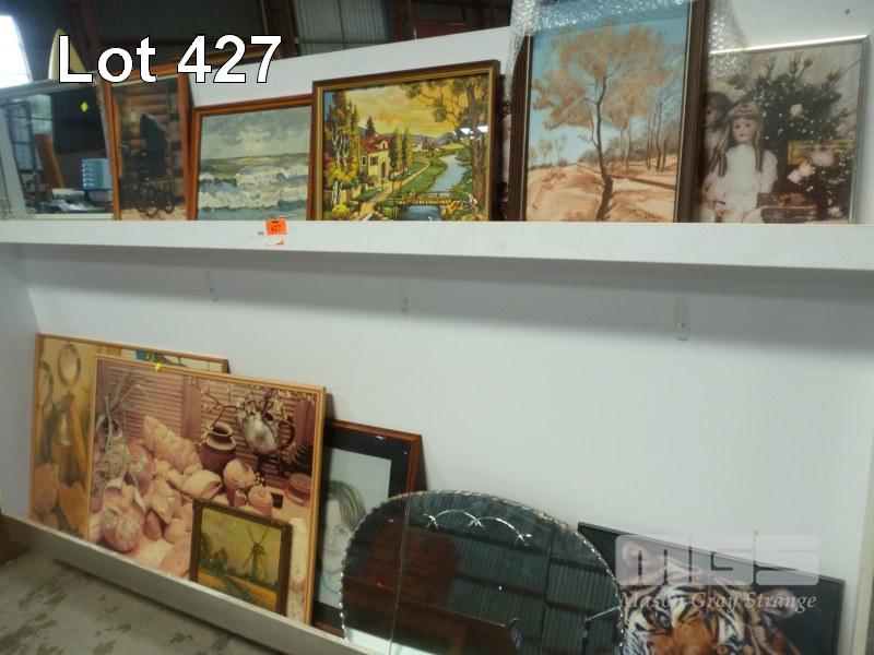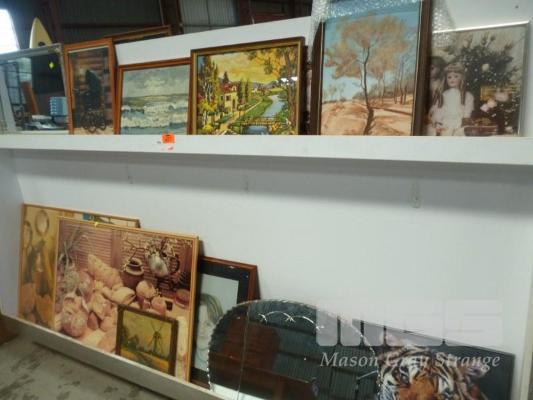 ASSORTED FRAMED PICTURES, PRINTS, PHOTOS & MIRRORS, 2 X SHELVES