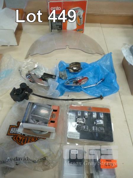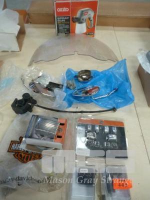 HARLEY DAVIDSON PARTS INCLUDING MIRRORS, WINDSHIELD, SWITCH CAPS. BRAKE RBBER PAD, RUBBER, OZITO SPRAY GUN, PEGS, ETC
