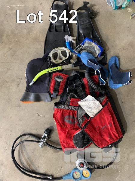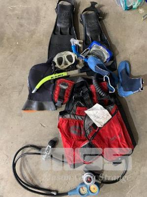 DACOR BUOYANCY CONTROL DEVICE MOD: 6327 OCEANIC REGULATOR, WITH MOUTH PIECE & DEPTH GAUGE 2 x PAIRS GOGGLES PAIR OCEANIC FLIPPERS, SIZE M PAIR BOOTIES, SIZE S