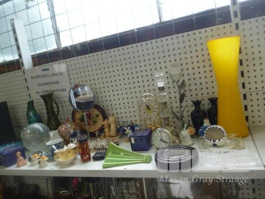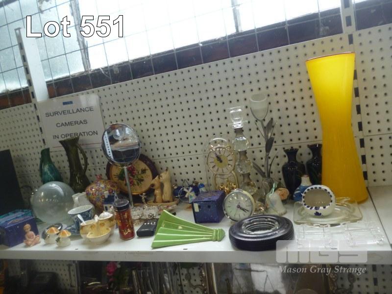 ASSORTED CERAMICWARE, ORNAMENTS, GLASSWARE, DOME CLOCK AND ROYAL WINTON TEAPOT, ETC