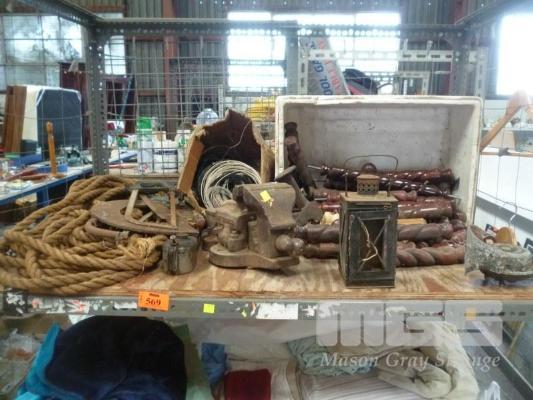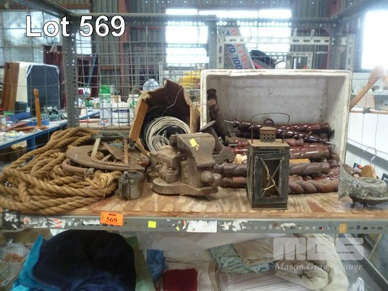 BENCH VICE, THICK ROPE, TIMBER LEGS, ETC