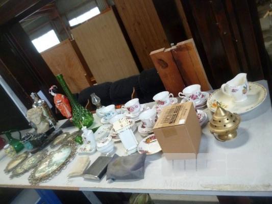 ASSORTED FINE CHINA TRIOS, QUEEN ANNE, ORNAMENTS, STATUE OF DAVID HEAD BUST MANTLE CLOCK & FRAMED FABRIC WALL HANGINGS