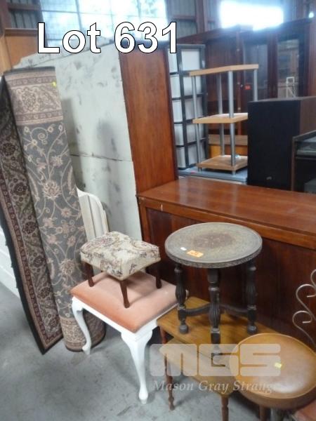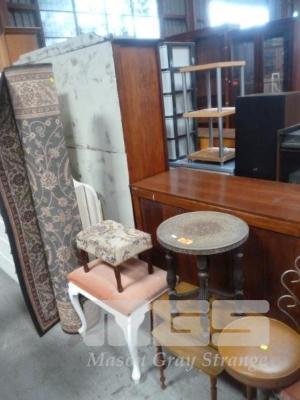 FLOOR RUG, BED STOOL, BRASS TOPPED TABLE, NEST OF 2 TABLES, BEDROOM CHAIR & VINYL STOOL