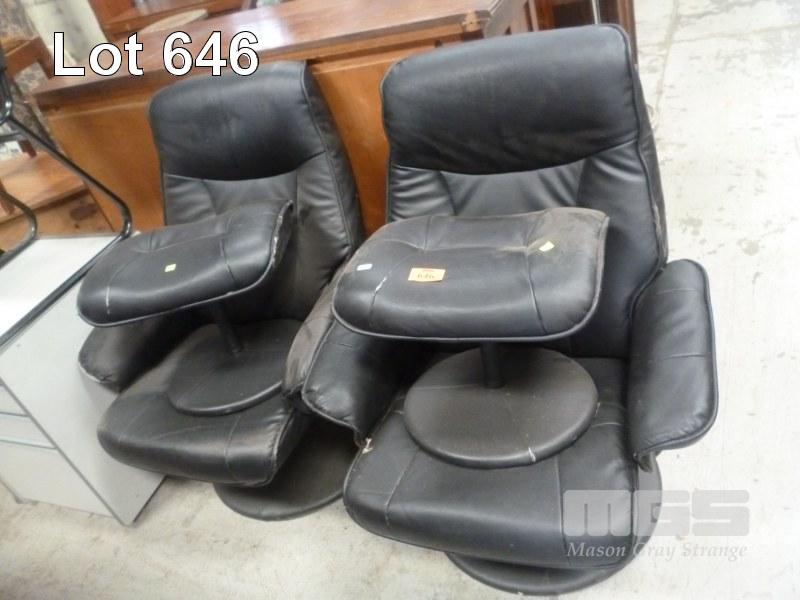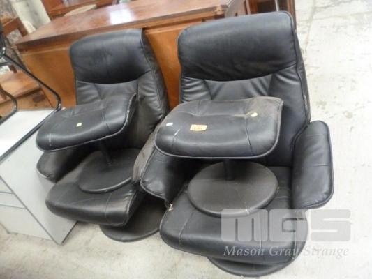 2 x BLACK VINYL UPHOLSTERED ARM CHAIRS WITH FOOT STOOLS