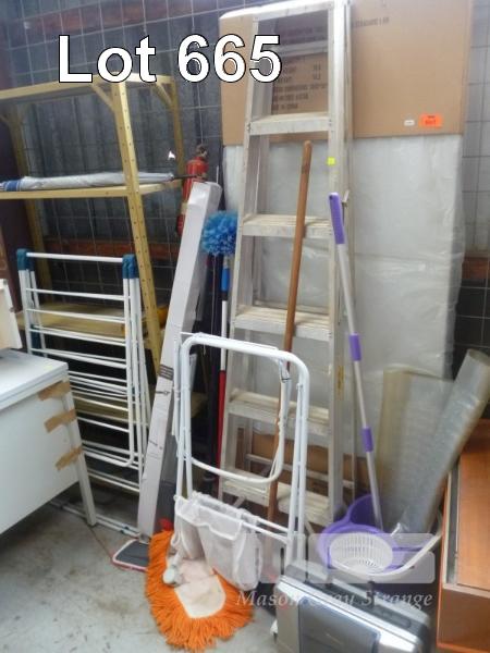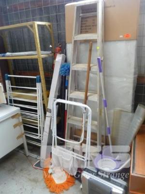 TRESTLE TABLE, ALUMINIUM A-FRAME LADDER, CLOTHES AIRER, CLEANING, SHELF UNIT, ETC