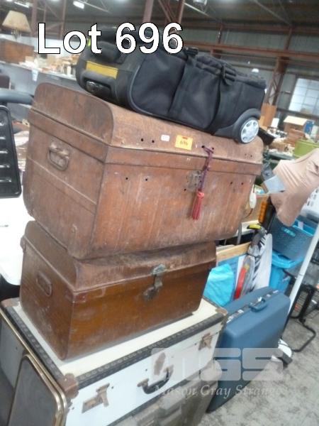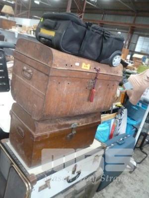 2 x STEEL TRUNKS, VINTAGE SUITCASES, STRONG BOX & FIRE SCREEN