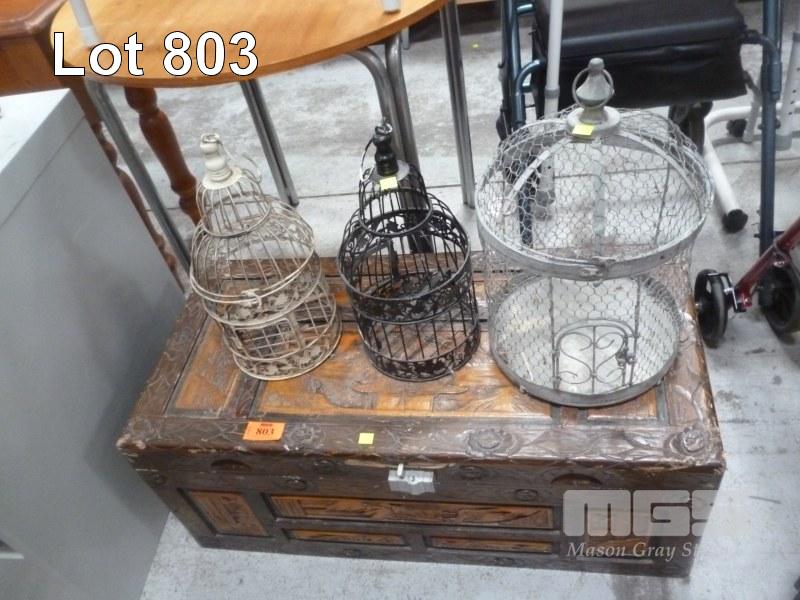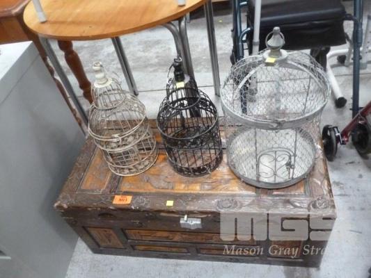 CARVED TIMBER BLANKET BOX, 3 X SMALL BIRD CAGES ETC