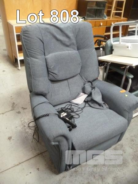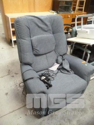 BLUE FABRIC LIFT CHAIR WITH BUILT IN BATTERY, POWER SUPPLY & REMOTE